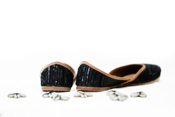 The stylish hipster and her go to shoe! A deep black base with stars like mirror scatters embroidered in silver zardosi taar. The back of the Jutti is a striking contrast to the subtle front, with chunks of 3D tassles handcrafted in metallic beads, coins and mirrors!